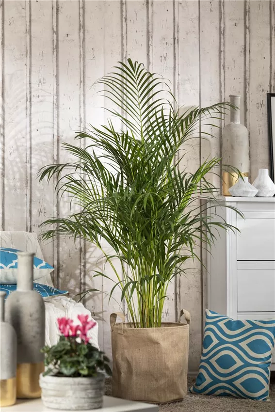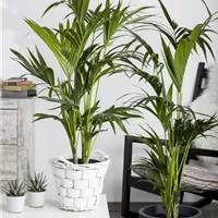 Wenn der Frühling noch nicht in Sicht ist und auch keine Fernreise auf dem Programm steht, wird unsere Sehnsucht nach exotischen Gefilden besonders groß. Dann hilft nur eins: Holen Sie sich die Tropen in Ihre vier Wände! Palmen bilden eine besonders attraktive „Untergruppe“ der Zimmerbäume. Viele Arten erreichen beeindruckende Wuchshöhen von zwei Metern oder mehr. So zählt die Bergpalme ( Chamaedorea elegans ) zu den besonders schnell wachsenden Vertretern ihrer Familie. Diese Zierpalme besitzt grazile, gefiederte Wedel und ist ausgesprochen pflegeleicht. Sie bevorzugt halbschattige bis schattige Standorte – keine direkte Sonneneinstrahlung! Gelegentliches Besprühen beugt braunen Blattspitzen vor. Die Kentiapalme ( Howea forsteriana ) besticht durch elegante, filigrane Wedel in dunklem Grün; sie kommt mit relativ wenig Licht und trockener Luft gut zurecht, was sie zur Ausnahmeerscheinung unter dem Palmen macht und auch für dunklere Raumecken prädestiniert. Zugluft und direkte Sonne meiden! Die Fischschwanzpalme ( Caryota mitis ) besitzt wie abgerissen aussehende Blätter, die ihr eine aparte Anmutung geben. Sie braucht einen hellen Standort und muss immer leicht feucht gehalten werden – Staunässe jedoch unbedingt vermeiden.