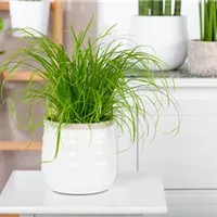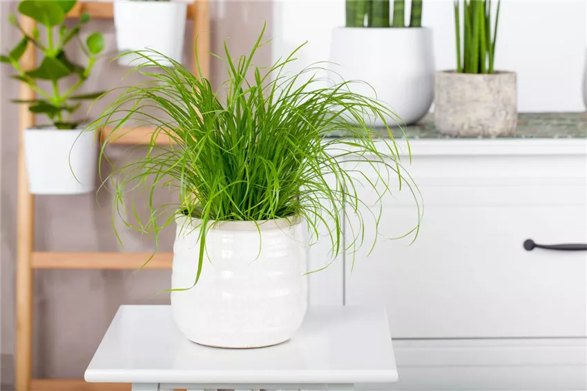 Pflegeleicht und mit skulpturaler Wirkung präsentieren sich die Vertreter der Drachenbäume ( Dracaena ), die leicht bis zu zwei Meter hoch werden. Für Dschungelambiente sorgt der Baumfreund ( Philodendron ), während buschig wachsender Bambus ( Bambusa ) für exotisches Asia-Flair steht. Filigrane Zimmerlinden ( Sparmannia africana) fügen sich perfekt in klassische bis rustikale Landhaus-Interieurs ein, während die Riesen-Alokasie ( Alocasia macrorrhiza ) mit ihrer grafischen Ausstrahlung jede moderne Wohnwelt bereichert. Ein besonderer Hingucker ist die Glückskastanie ( Pachira aquatica ), auch Wilder Kakaobaum genannt. Oft werden mehrere Pflanzen zu einem Stamm geflochten, was ihr ein besonders apartes Erscheinungsbild verleiht. Zwischen zwei Wassergaben sollte man die Erde gut trocknen lassen; auf Staunässe reagiert sie sehr empfindlich. Auch Zypergras ( Cyperus ) kann zu einem stattlichen, bis anderthalb Meter hohen Mitbewohner heranwachsen. Pflegeleicht und anspruchslos, muss man bei Zypergras darauf achten, ausreichend zu gießen, denn es zu den ganz wenigen Zimmerpflanzen, die Staunässe nicht übel nehmen – im Gegenteil! Attraktiv ist Zypergras dank seiner eleganten Wedel auch in Solitärstellung.